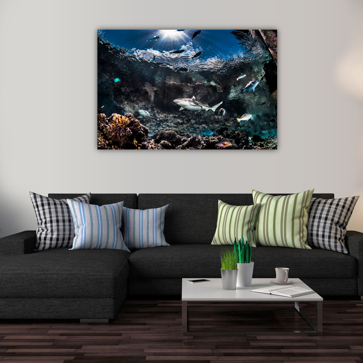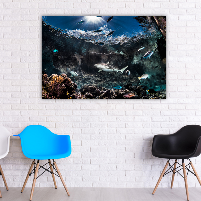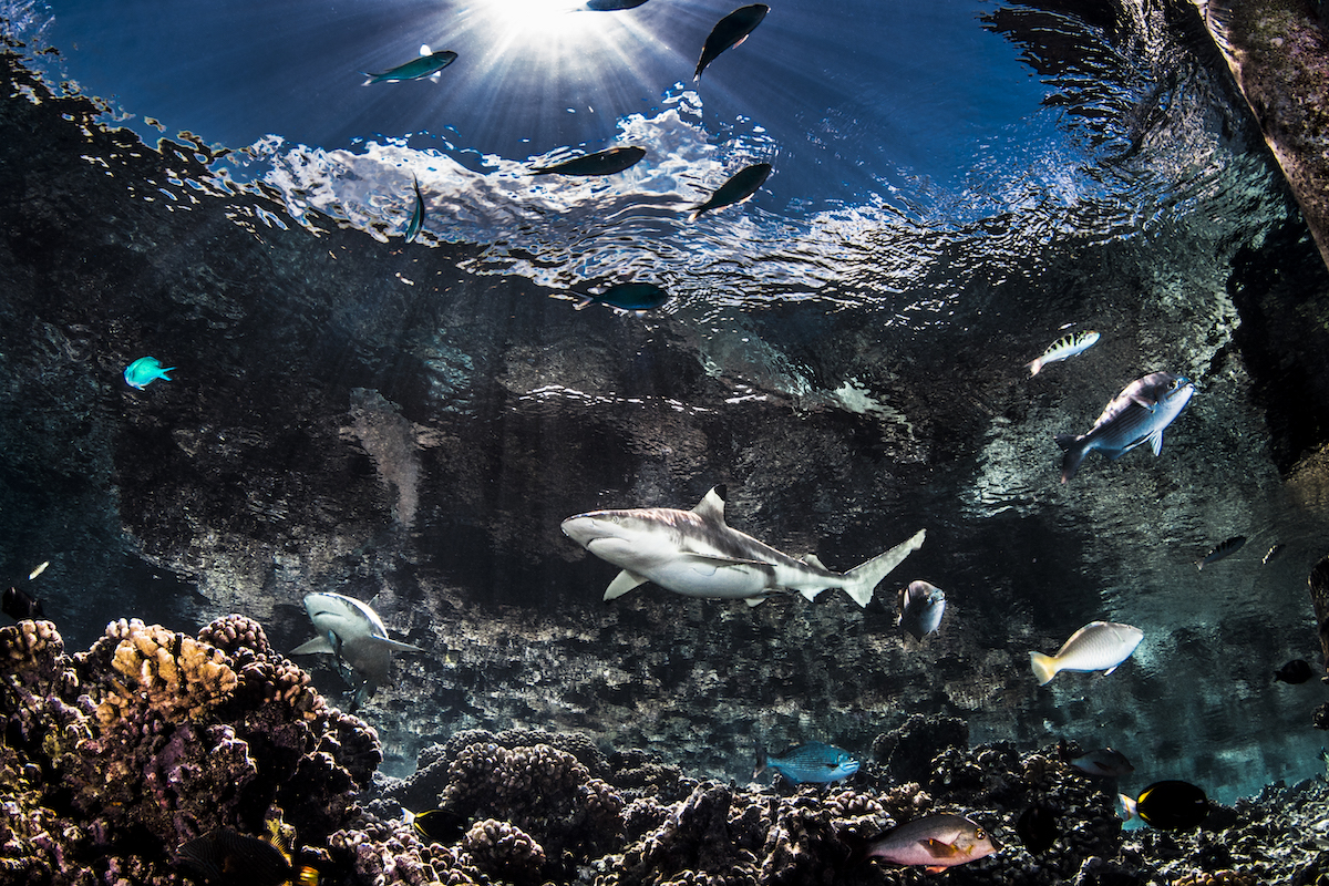 This image of blacktip reef sharks was taken in French Polynesia. The water was relatively shallow, which Craig used to his advantage as it allows the viewer to see the beautiful sun's rays penetrating the surface. The contrast between the slate color of the sharks to the dark blue of the sky and the bright colors of the reef fishes is very striking. The movement of the water's surface gives the viewer the feeling of being in a large aquarium.